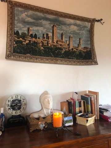 Picture, Renaissance tapestry and Dante candle from Eve Solis.
